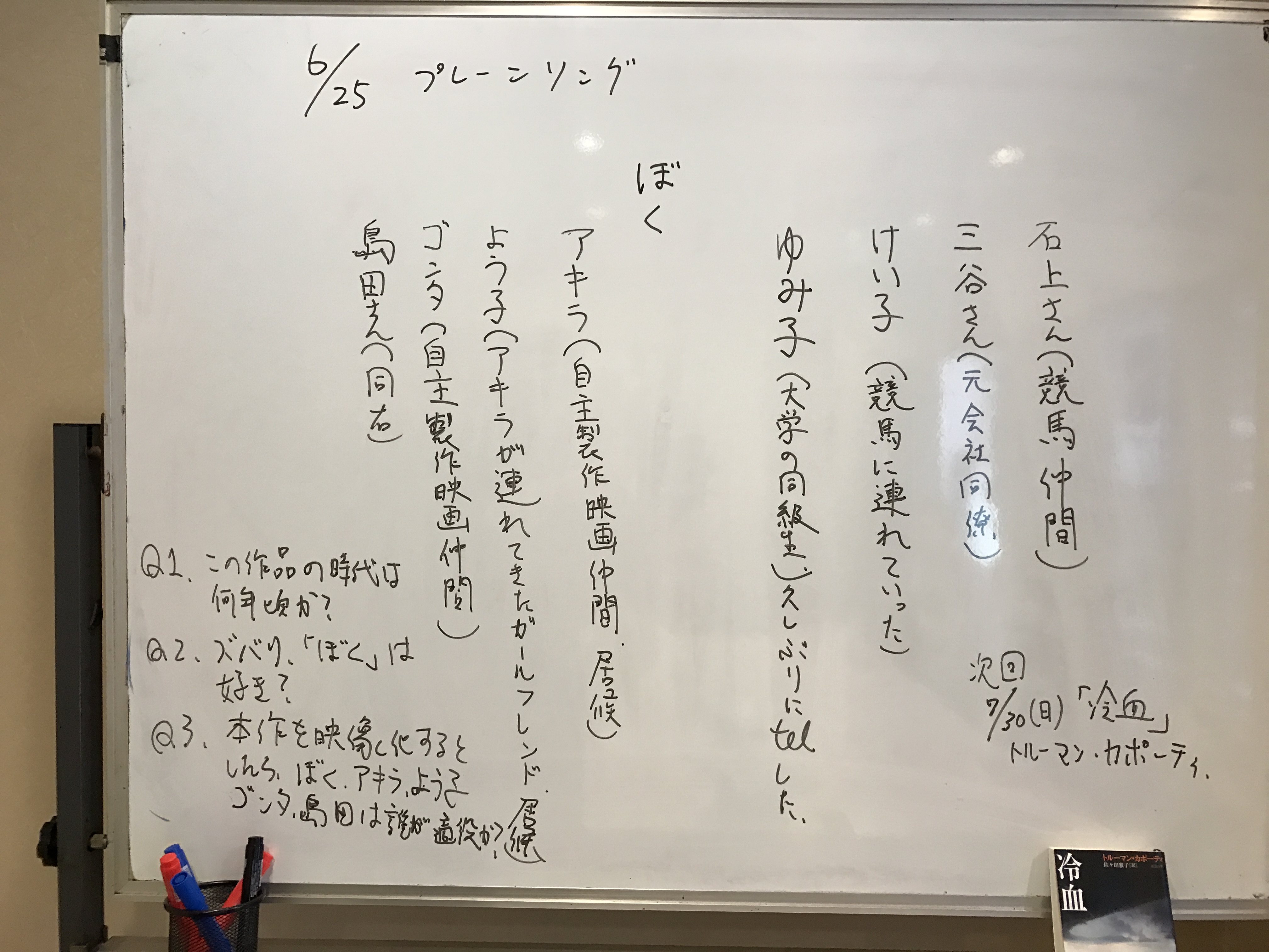 ↓おまけ、今回のホワイトボード、登場人物一覧…